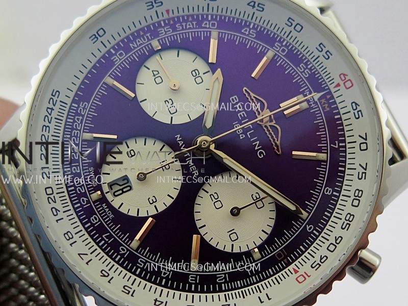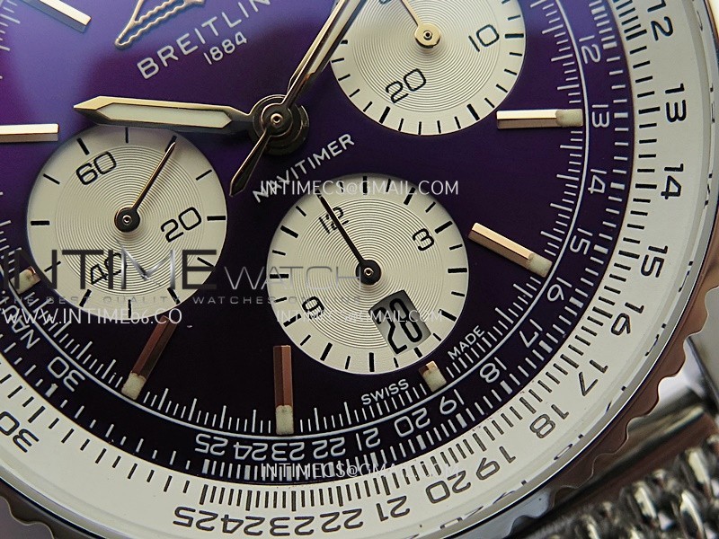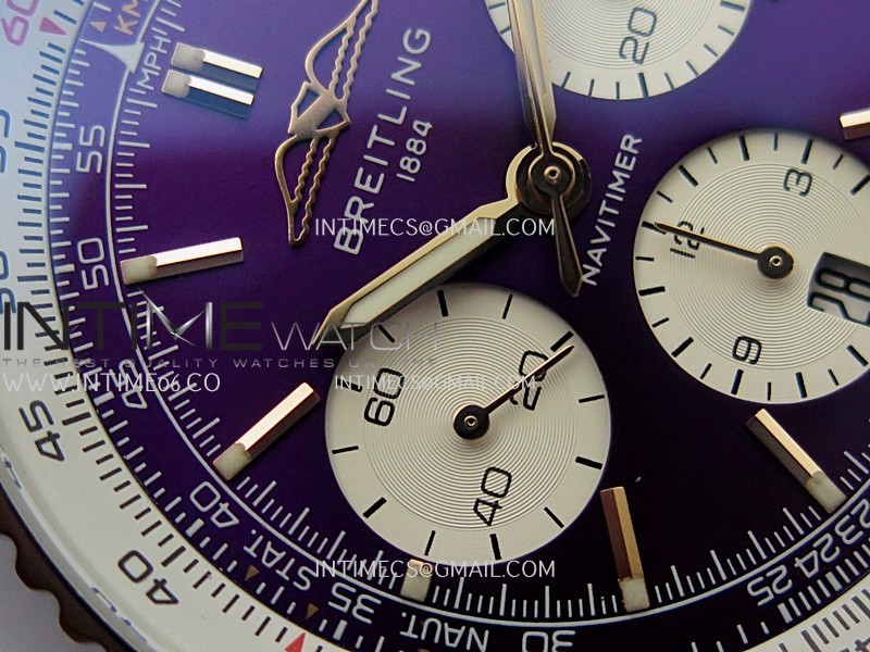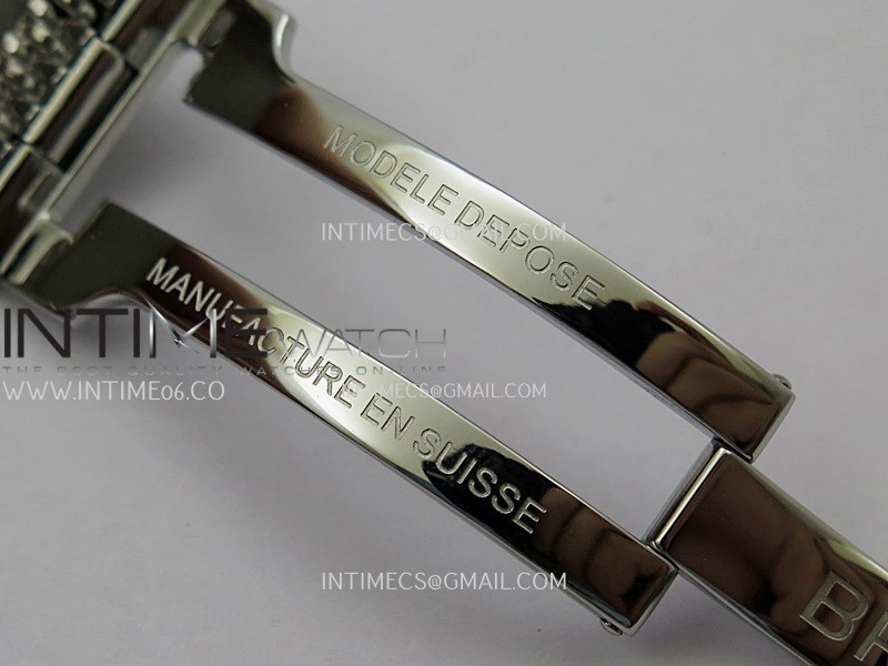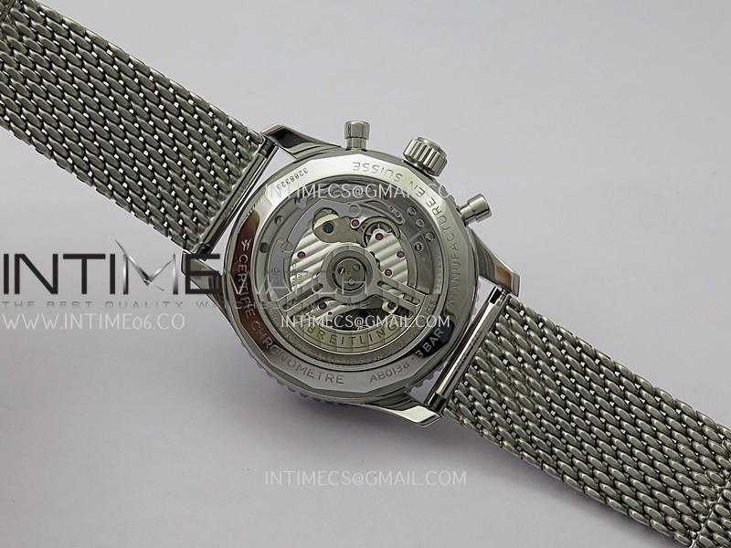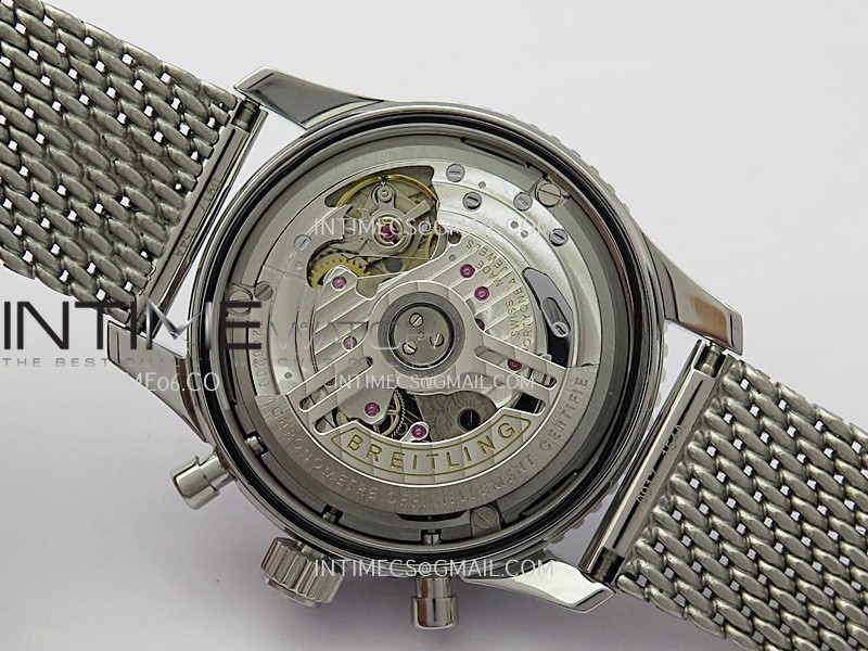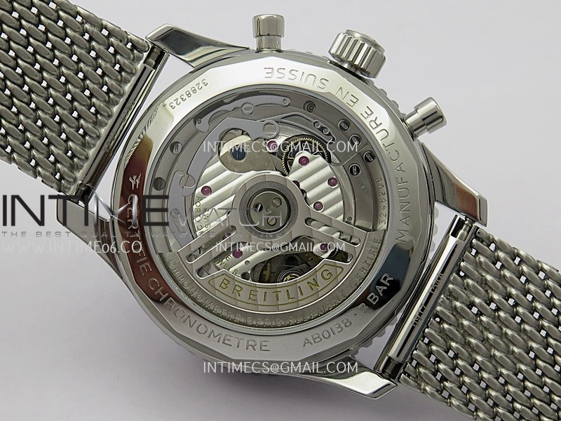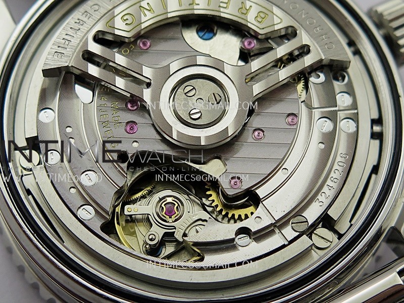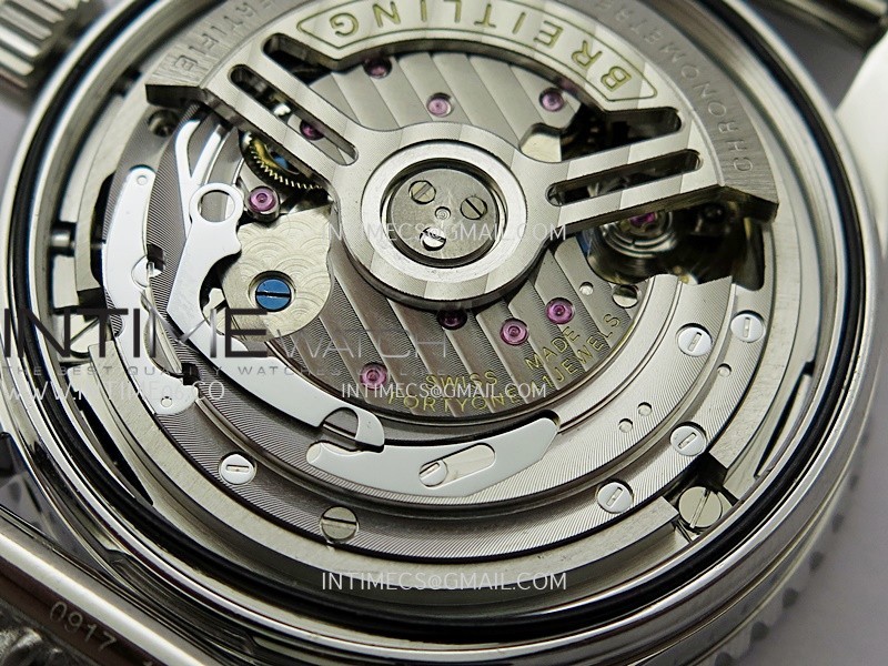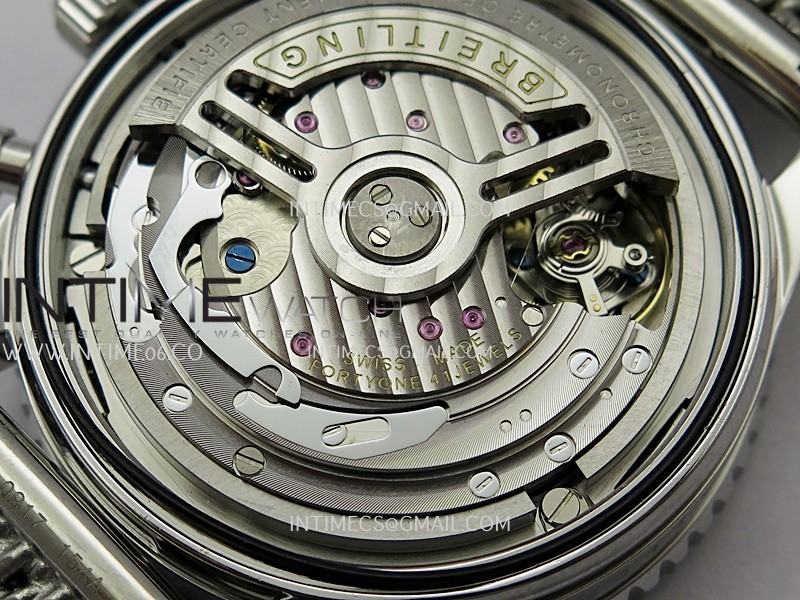 Movement: Base Movement: Asian 7750 automatic chronograph movement at 28800vph; Decoration: Platinum plated movement plate and rotor which are made according to the genuine movement, the best looking Breitling Calibre Movement Clone at the moment.