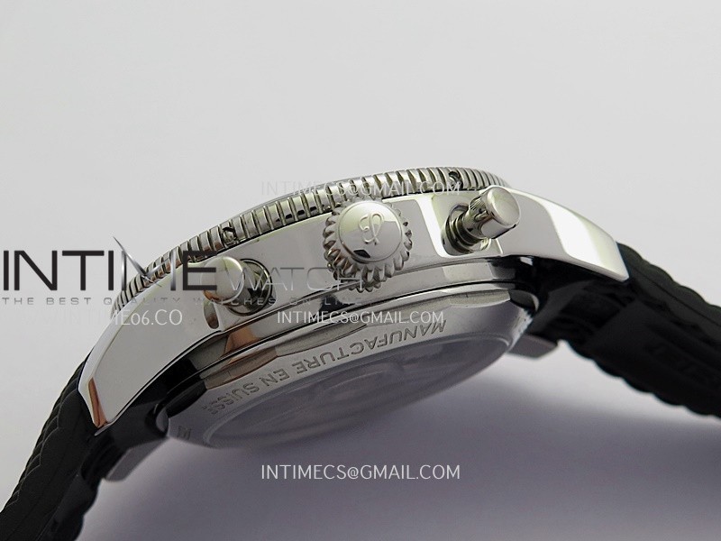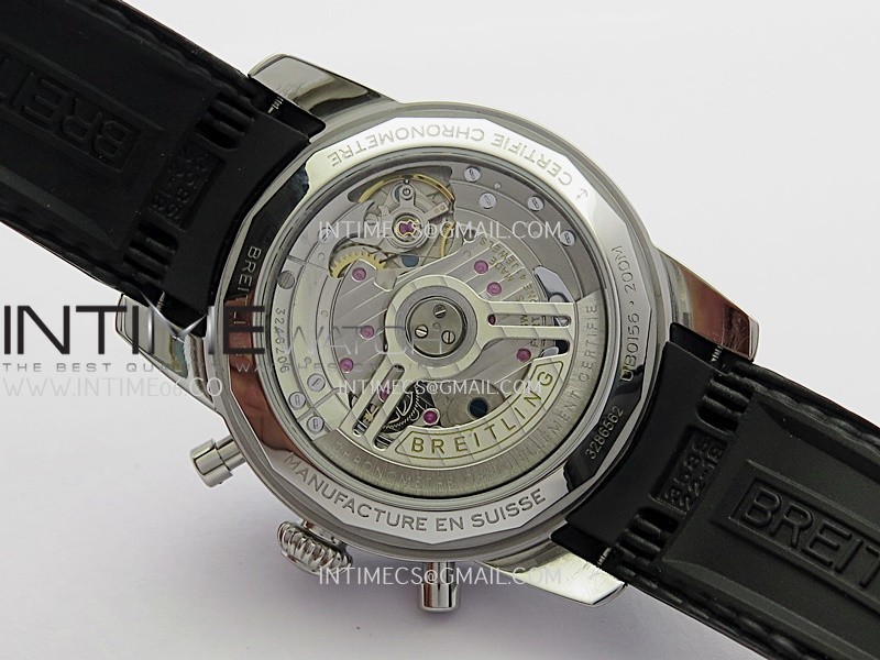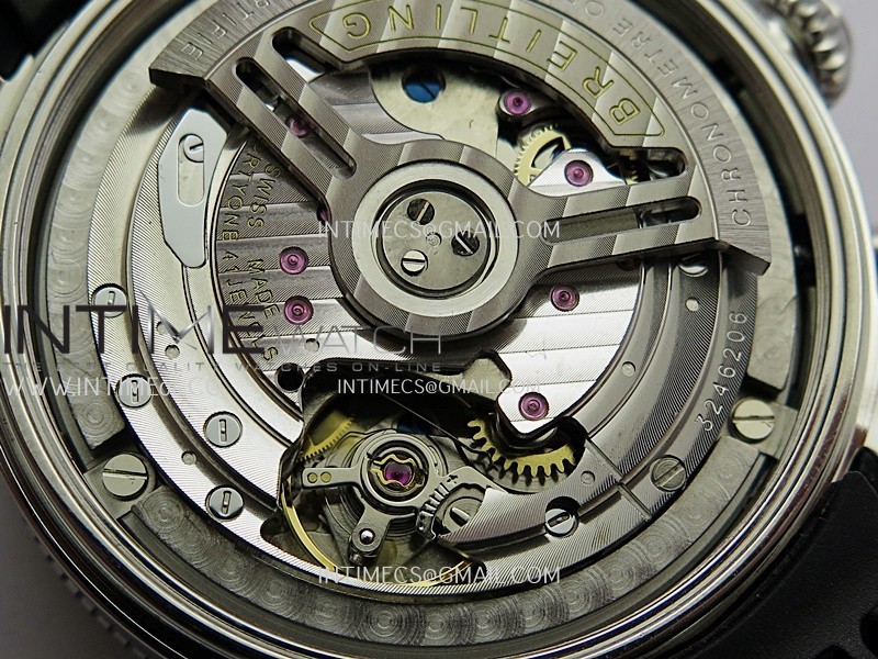 Movement: Base Movement: Asian 7750 automatic chronograph movement at 28800vph; Decoration: Platinum plated movement plate and rotor which are made according to the genuine movement, the best looking Breitling Calibre Movement Clone at the moment.
