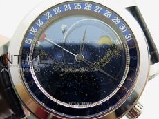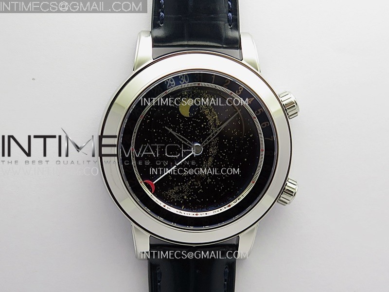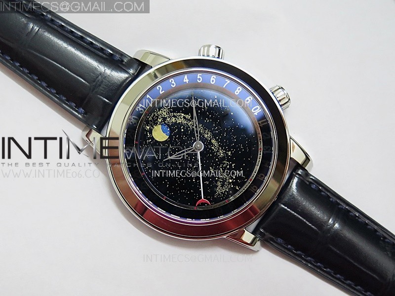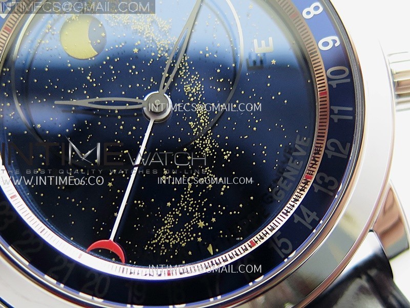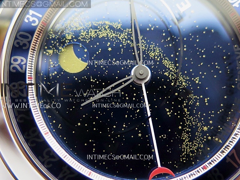 Functions Hours, minutes, date and moonphase display (The upper crown is used for time adjustment, while the lower crown is for manually adjusting the dial disc. The dial disc operates manually, not automatically. The round side button adjusts the date and simultaneously moves the moon phase display.)