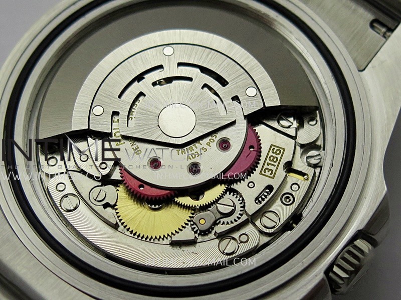 Asian Super Clone 3186 Automatic Movement at 28800 vph, Correct Handstack, self-winding, independent adjustable hour hand to set the date, same adjusting as genuine