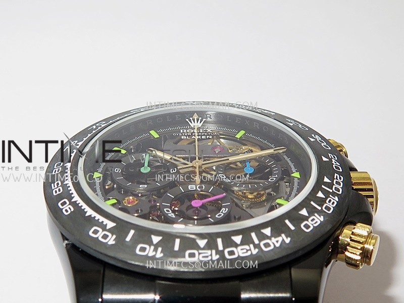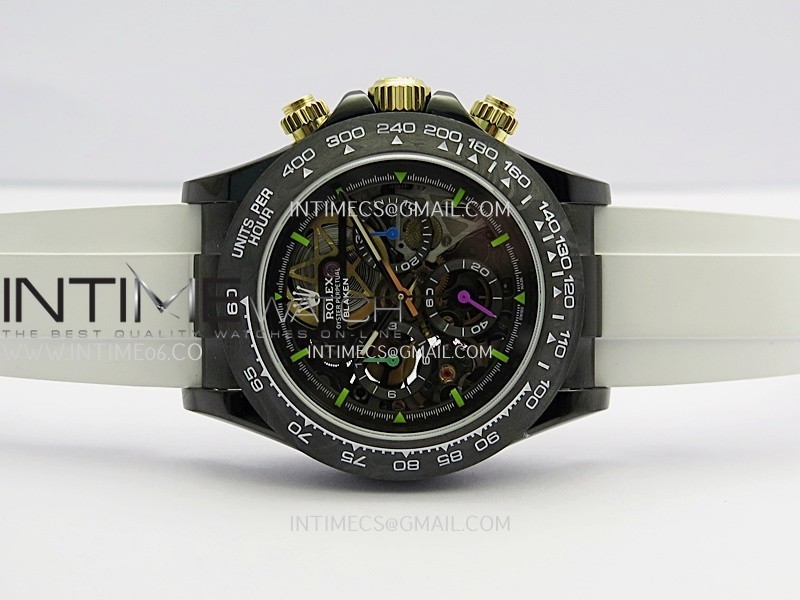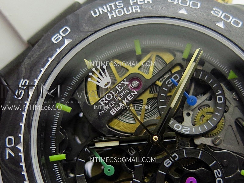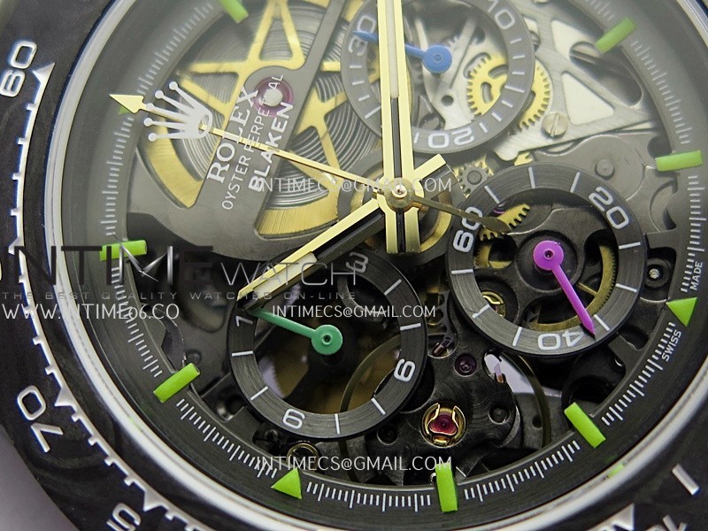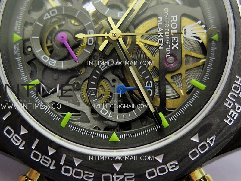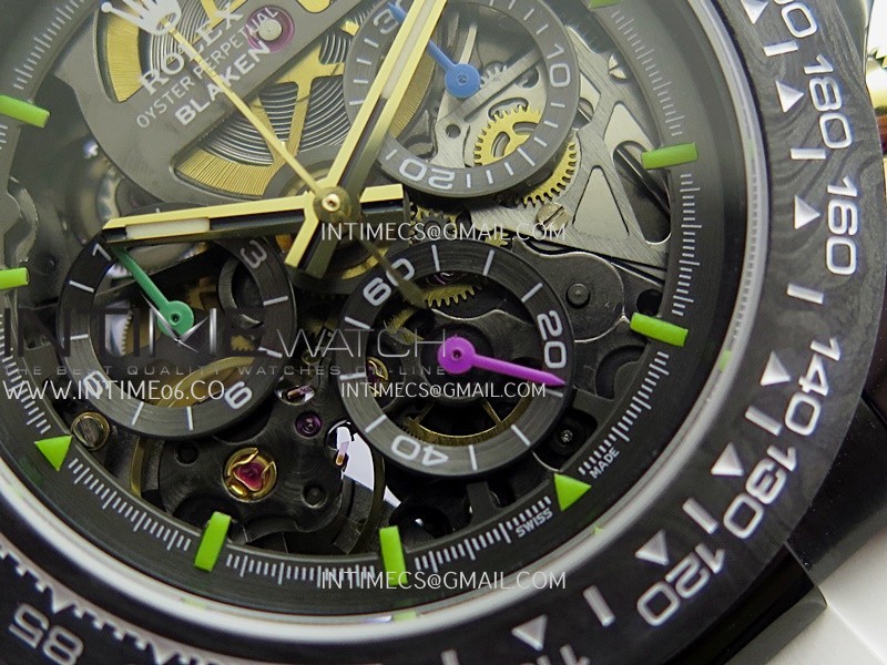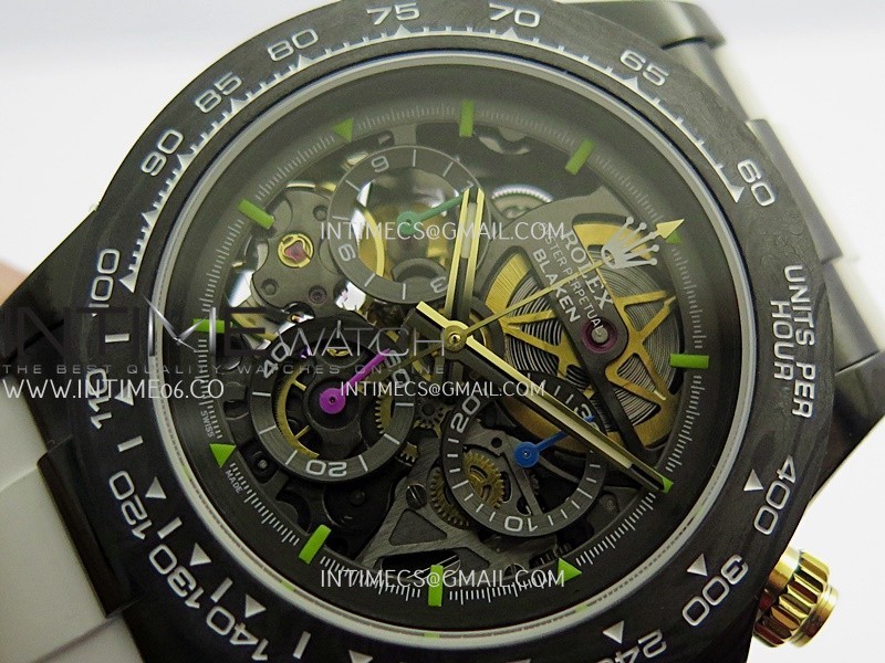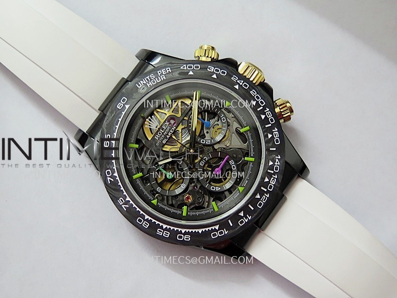Movement Custom made skeleton Asian Super Clone4130 movement 28800vph, 1:1 replicated from the genuine movement, fully functional. Blue spring same as genuine.