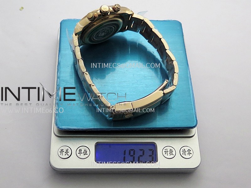 Case 18K rose gold plated 904L stainless steel case and Cu-W metal to increase watch weight to match the genuine gold watch weight, almost same weight as genuine watch